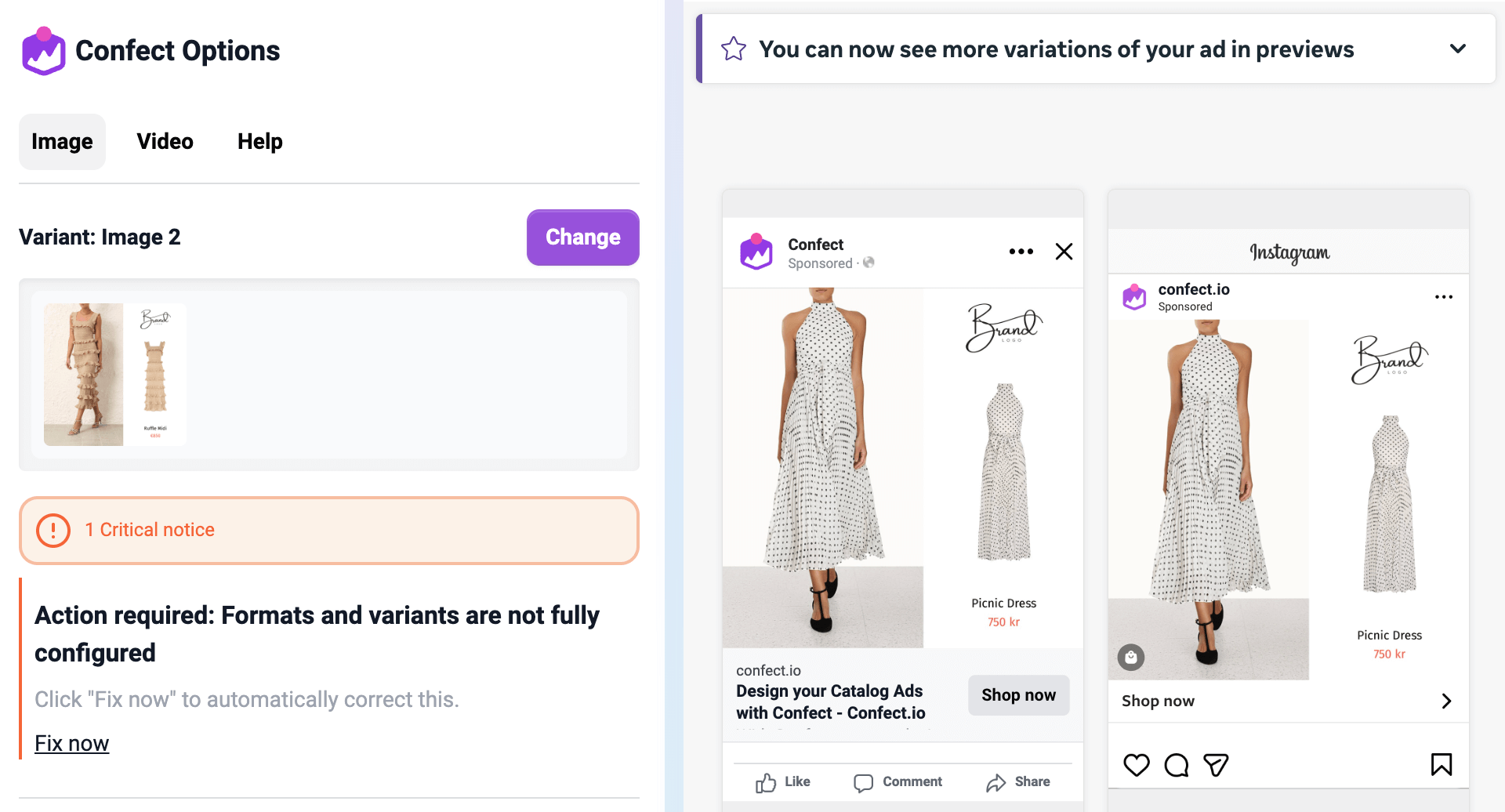 The last step to adaptive Catalog Ads is to go into your ads and use the "Confect options" plugin to enable this - click "Fix now".